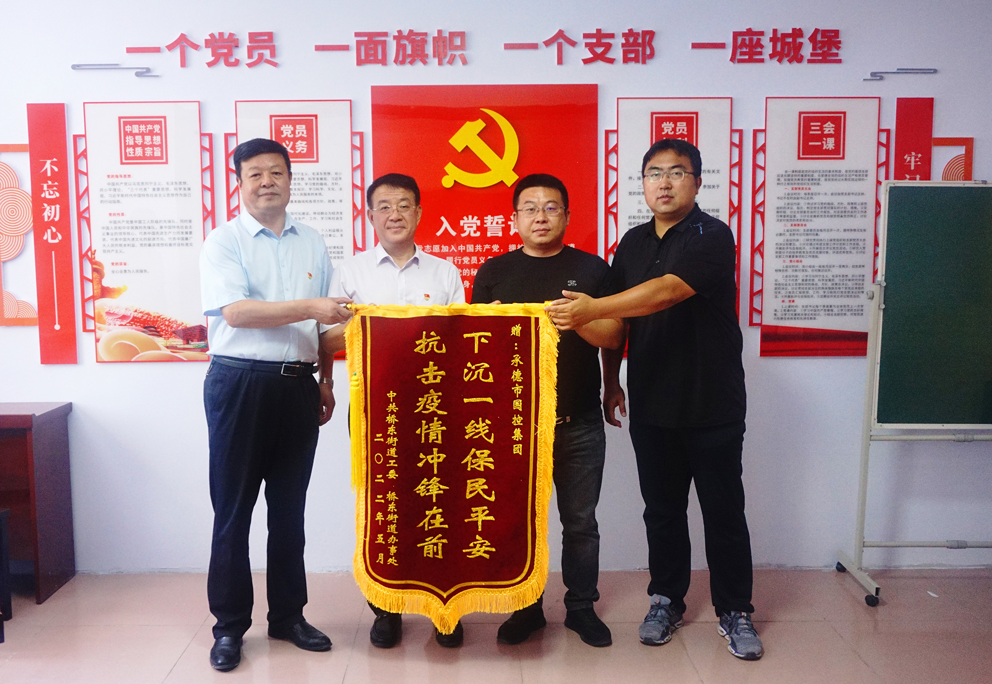 捐贈儀式后,國控集團領(lǐng)導(dǎo)班子與橋東街道、會龍山社區(qū)主要負責人,就結(jié)對幫建工作進行座談,詳細了解了創(chuàng)城工作開展情況、存在問題及下一步打算,針對社區(qū)基礎(chǔ)設(shè)施不完善、公共停車泊位施劃不合理、樓道雜亂和小廣告亂貼等問題,研究制定了具體舉措。會上,為感謝國控集團在抗擊疫情和結(jié)對幫建工作中的大力支持,橋東街道、會龍山社區(qū)向集團公司贈送了“下沉一線保民平安、抗擊疫情沖鋒在前”錦旗。